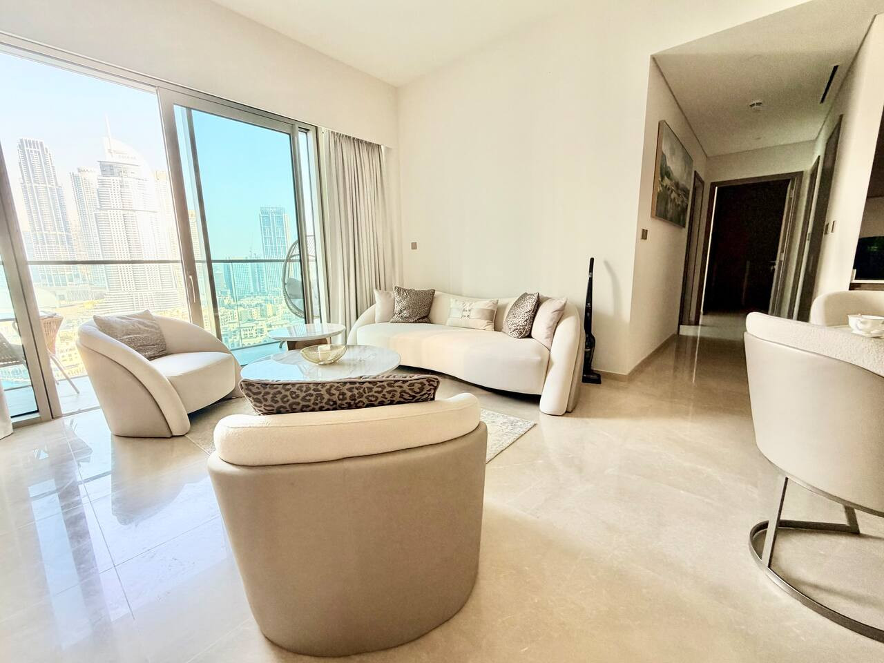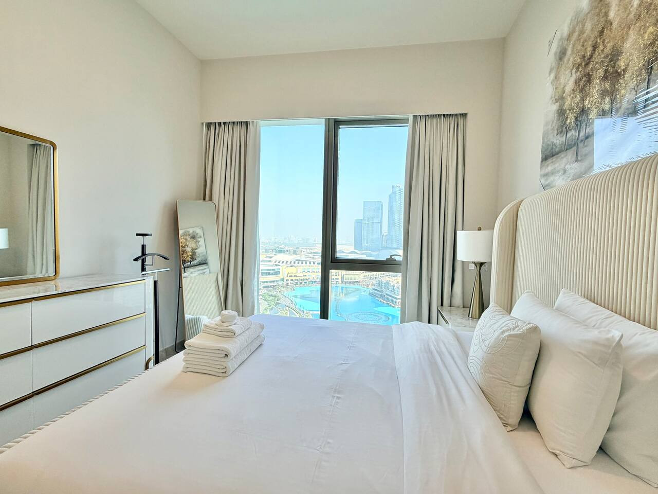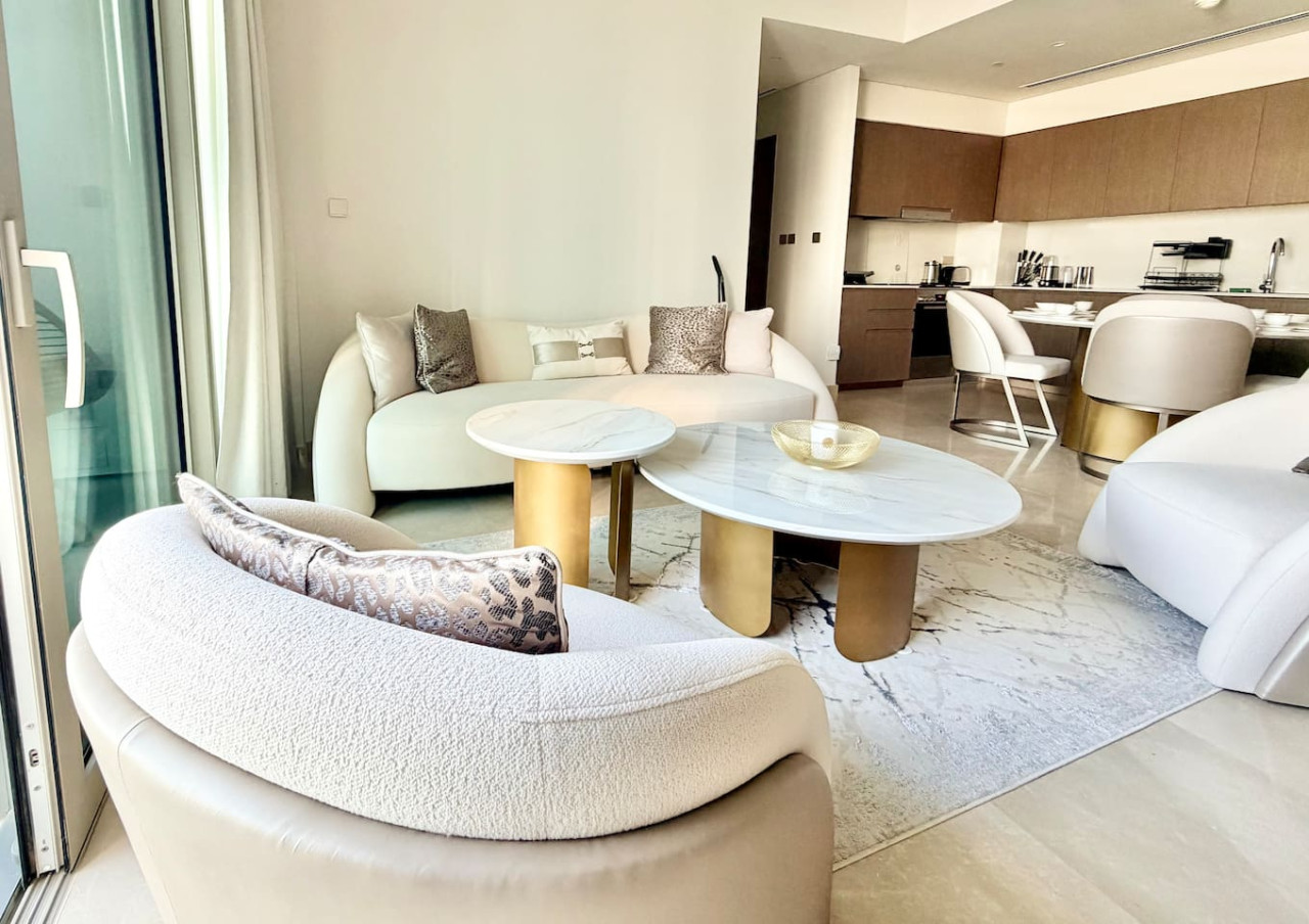 Experience unmatched elegance in this premium 2-bedroom luxury residence located on the 21st floor of the iconic Grande Signature Tower in Downtown Dubai. Designed for comfort and style, this stunning home offers breathtaking, unobstructed views of the Burj Khalifa and the Dubai Fountain from both bedrooms, the living room, and the private balcony—a rare and unforgettable feature. Step into a bright, modern space with high-end finishes, floor-to-ceiling windows, and tasteful contemporary décor. Both bedrooms feature plush king-size beds, ensuring restful nights, while two beautifully appointed bathrooms add convenience and privacy for couples, families, or business travelers. The open-plan living and dining area is perfect for relaxation or entertaining, with the world’s most famous skyline as your backdrop. Enjoy morning coffee or evening sunsets on the balcony as the fountain show dances below. Located in one of Downtown Dubai’s most prestigious towers, you’ll have easy access to the Dubai Mall, Opera District, Burj Park, and an array of fine dining and entertainment options—all within walking distance. 🏡 Highlights: • 2 luxurious bedrooms with king beds • 2 modern, stylish bathrooms • Panoramic Burj Khalifa & Fountain views • High-floor (21st) premium position • Floor-to-ceiling windows throughout • Balcony overlooking Dubai’s most iconic landmarks • Fully equipped kitchen • Elegant contemporary interiors • Access to building amenities (pool, gym, etc.) Whether you’re visiting Dubai for leisure or business, this residence offers a truly elevated stay—where comfort meets luxury and every moment comes with a spectacular view.